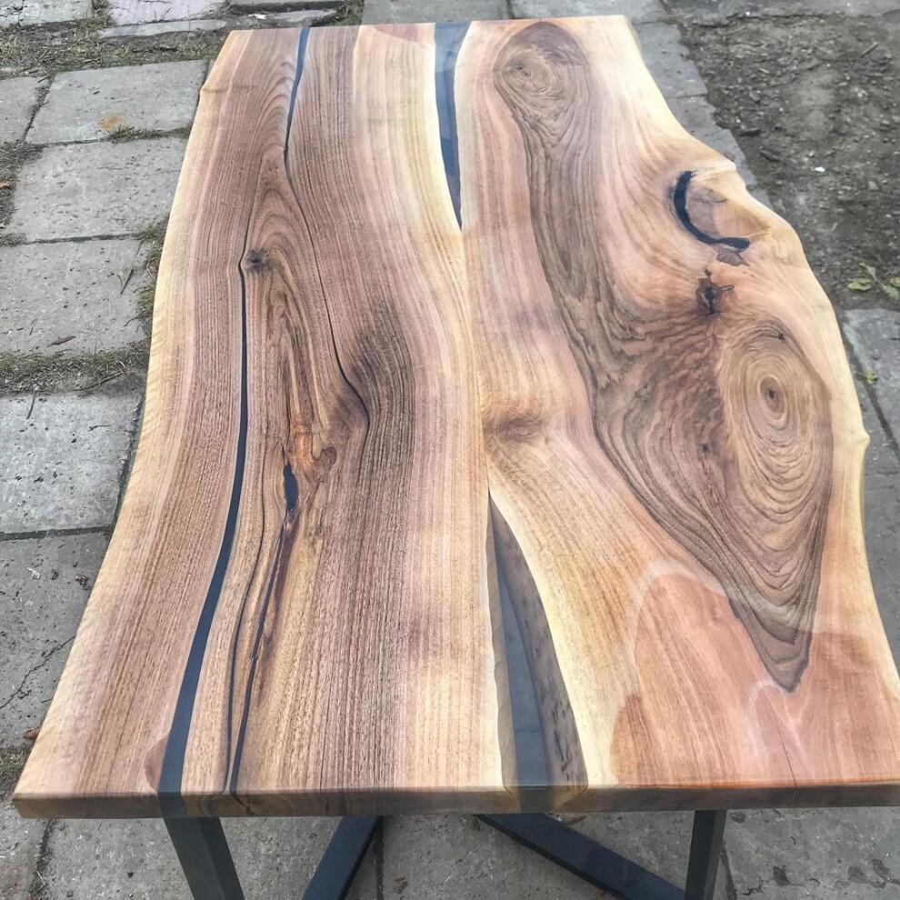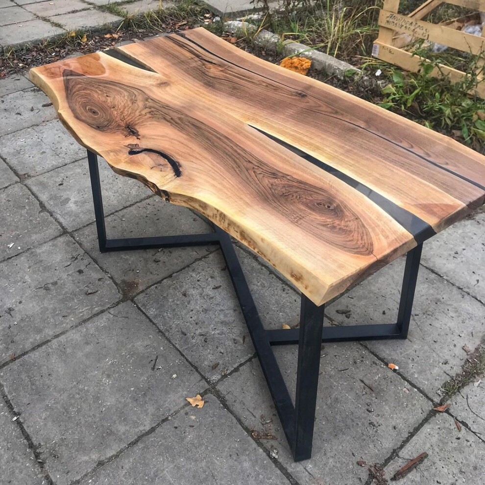 Столешница для этого стола сделана из двух соседних досок ореха. Подстолье — металлический профиль. Прекрасно сохранилась естественная форма и рисунок.Изделия из натурального орехового массива великолепно выглядят дома и в открытых для публики заведениях. Они привлекательные и престижные, нравятся клиентам, и случайные посетители становятся завсегдатаями. Красивые сучки и трещины тщательно обработаны и залиты долговечной смолой . Сохранен естественный рисунок древесины.