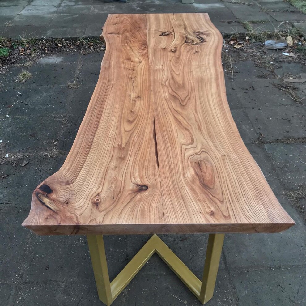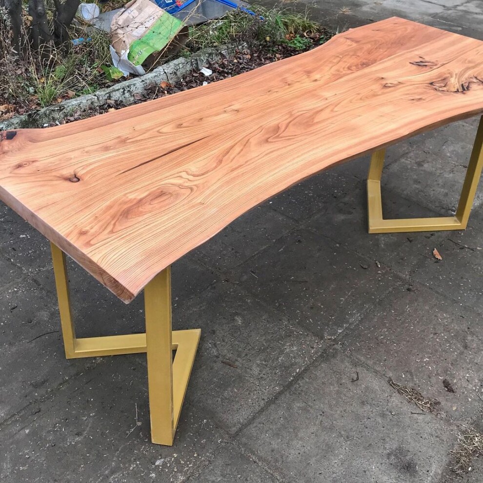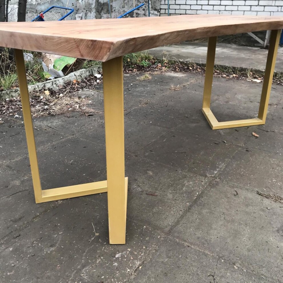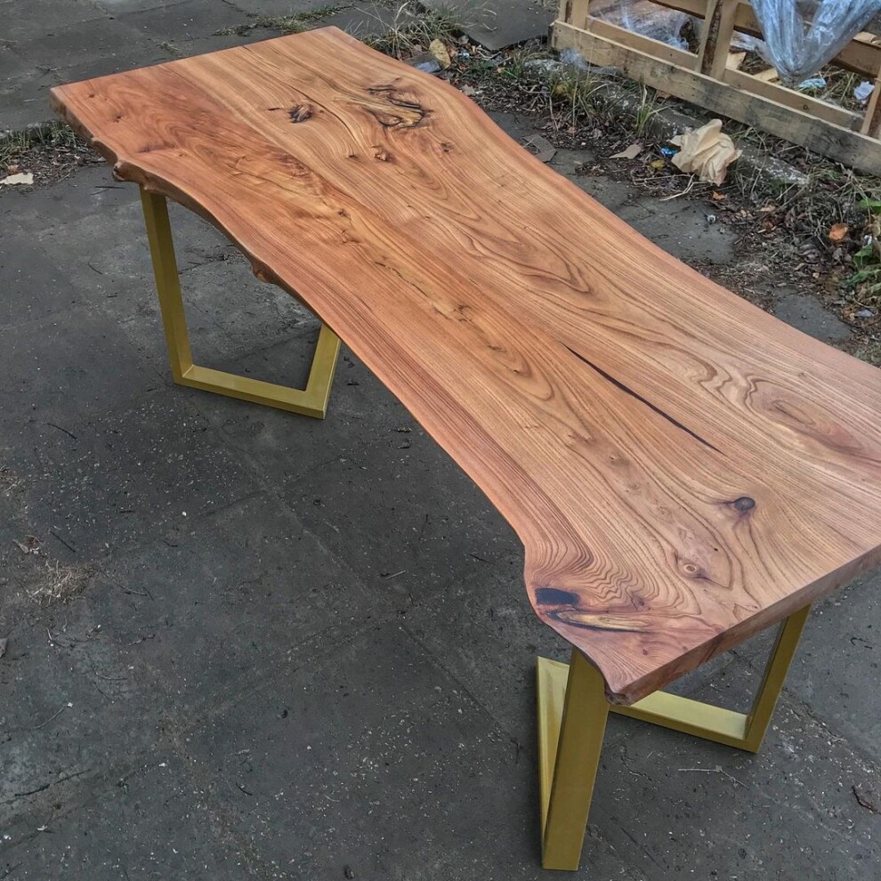 Стол выполнен из натуральных продольных спилов карагача. Подстолье металлическое. Покрыт итальянским масло