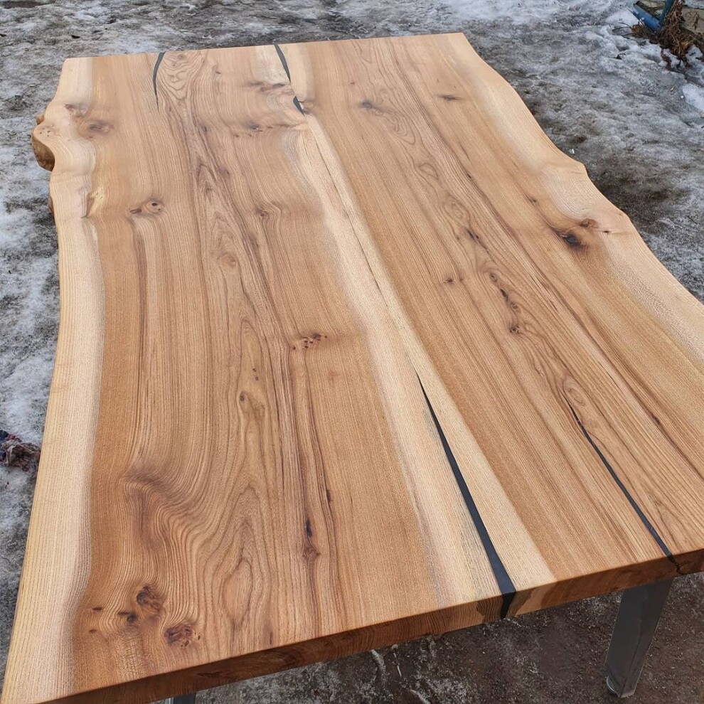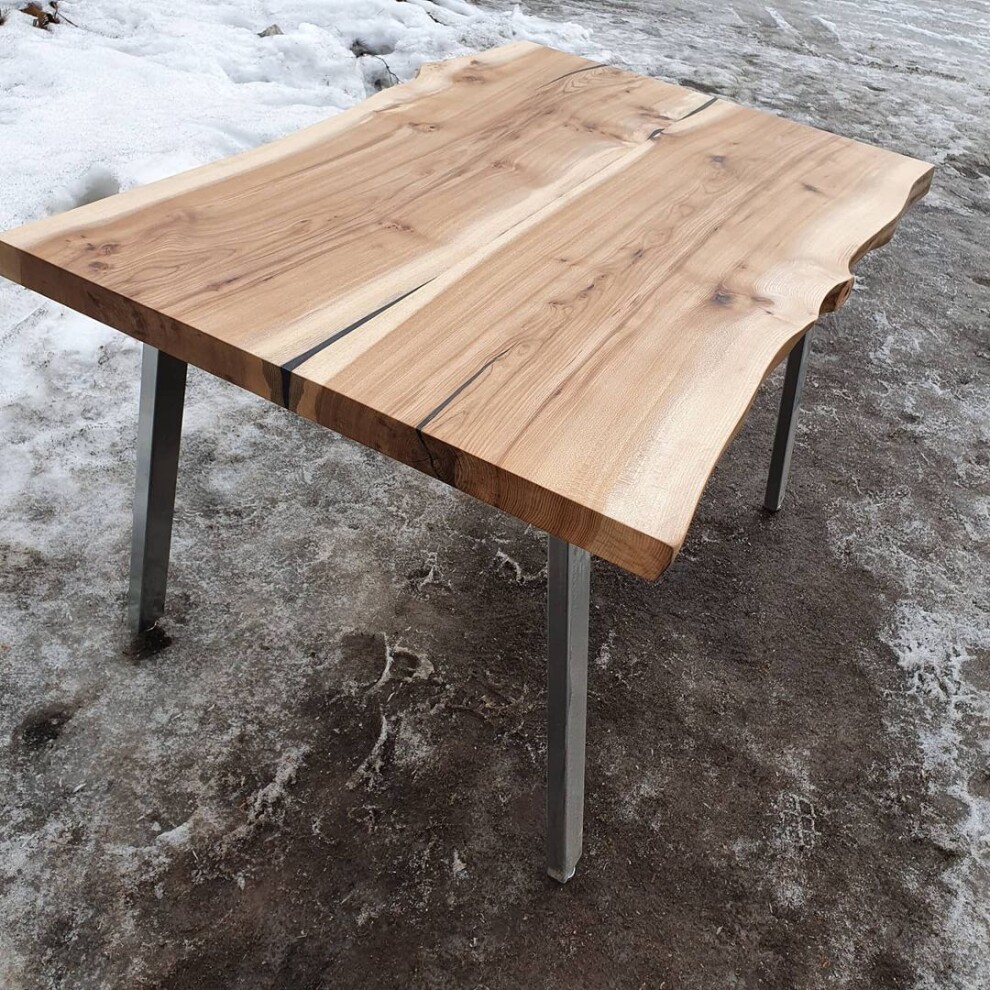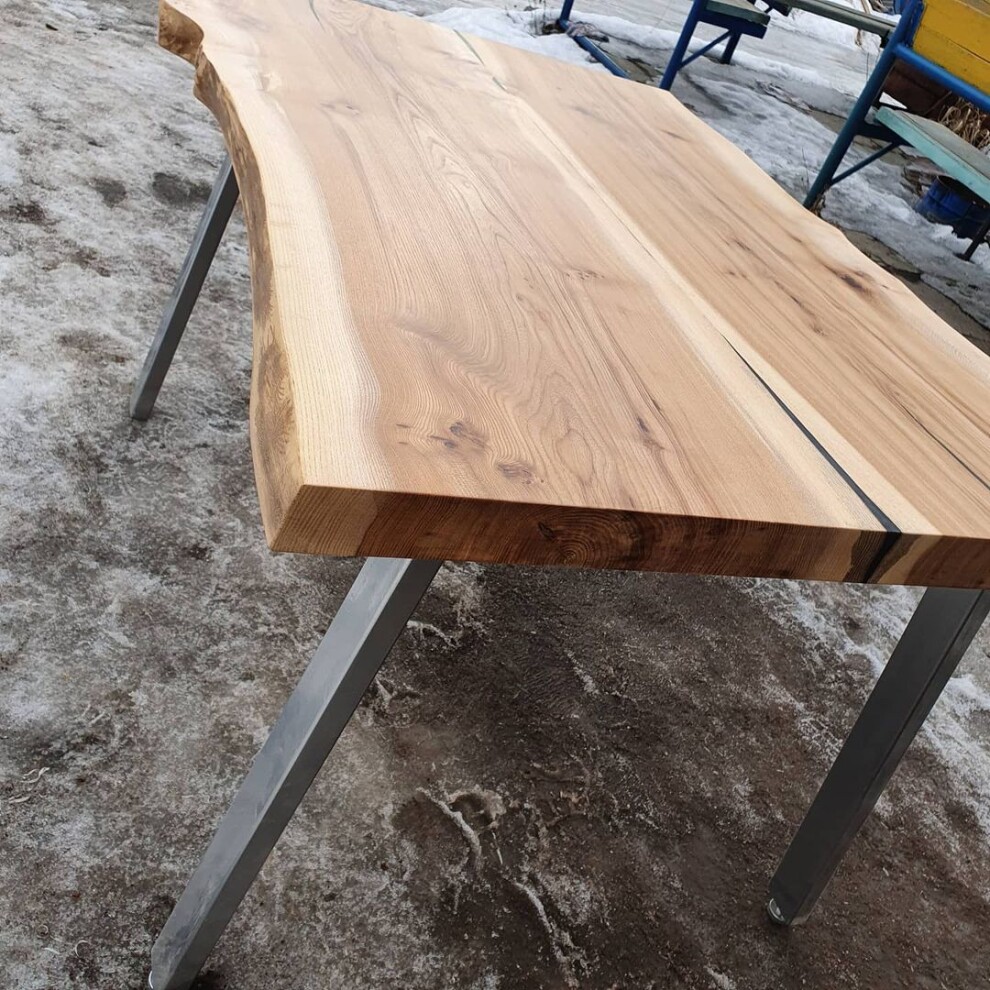 Стол выполнен из натуральных продольных спилов карагача. Подстолье металлическое. Покрыт итальянским масло