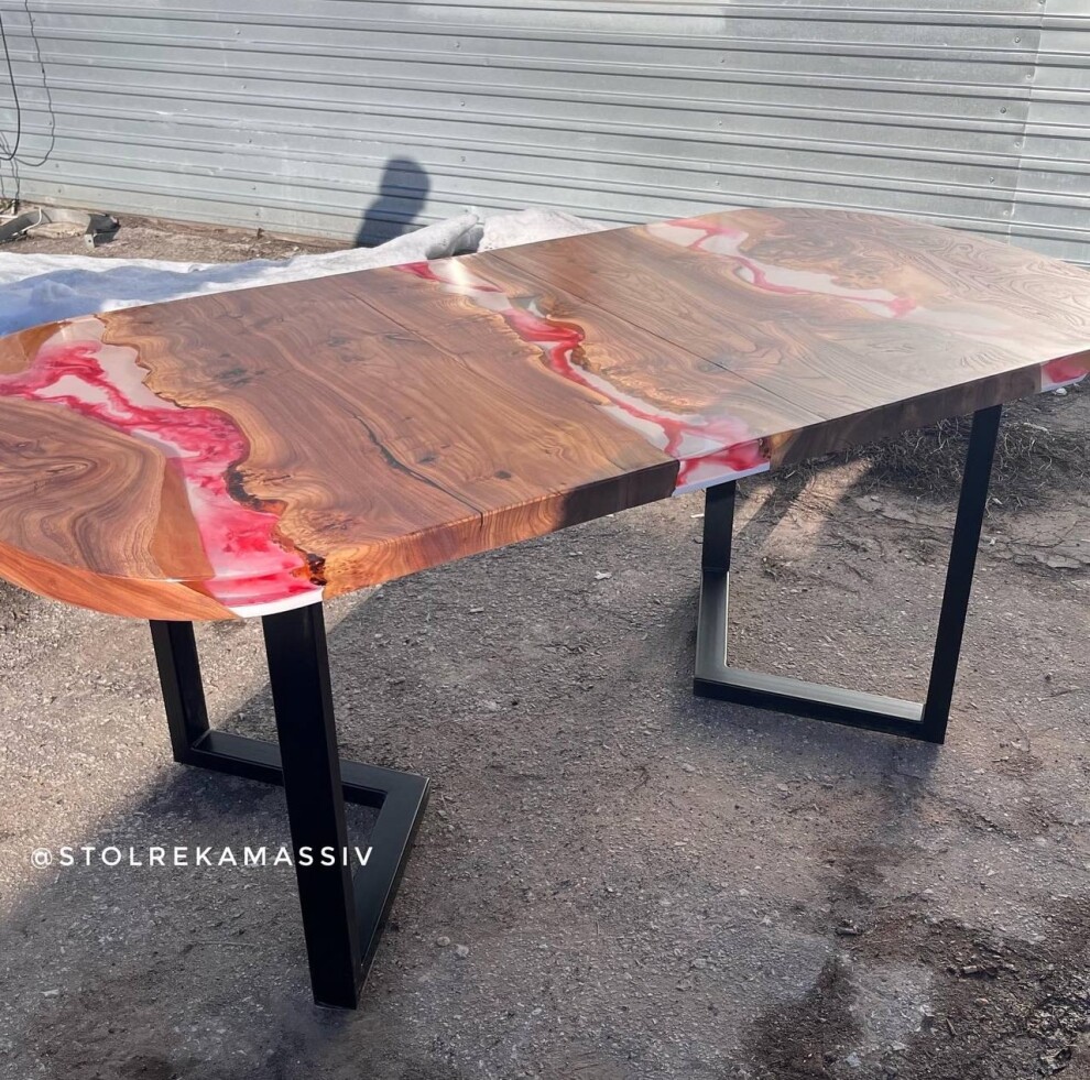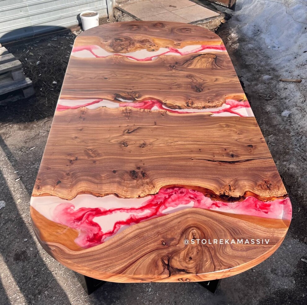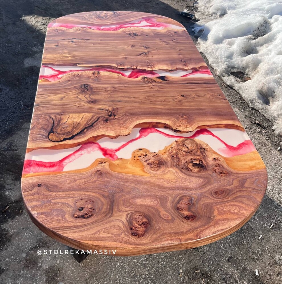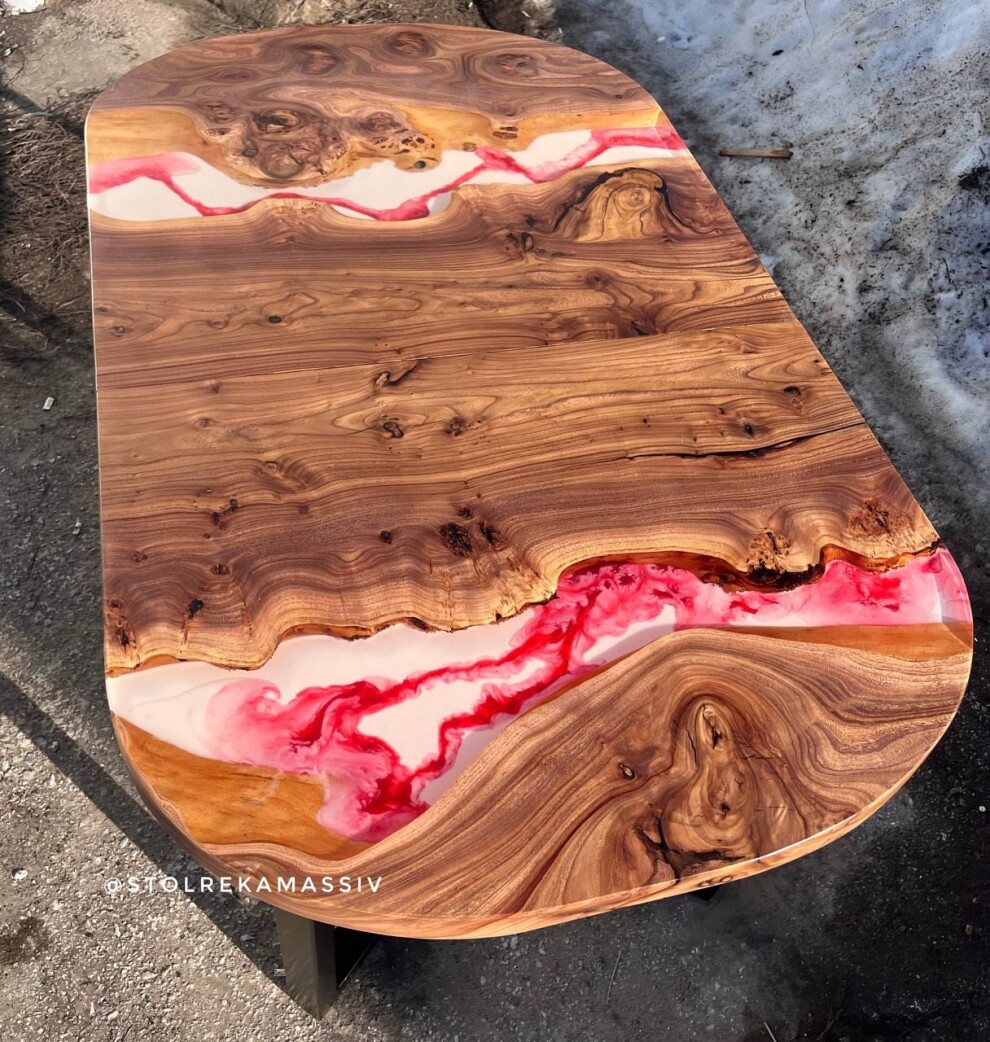 Овальный стол «Река» из массива карагача с белой заливкой и красными волнами станет ярким акцентом в вашем интерьере. Размеры стола: 160х80х75 см.