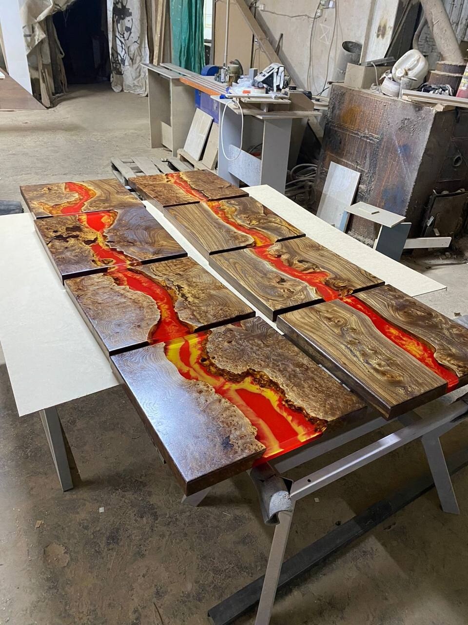 Мы начинаем заливать, дальше мы покрываем стол маслом или лаком. Затем, изготавливаем и красим ножки , после этого мы собираем вместе с ножками стол, фотографируем вам, если все хорошо ,вы отправляете вторую часть.