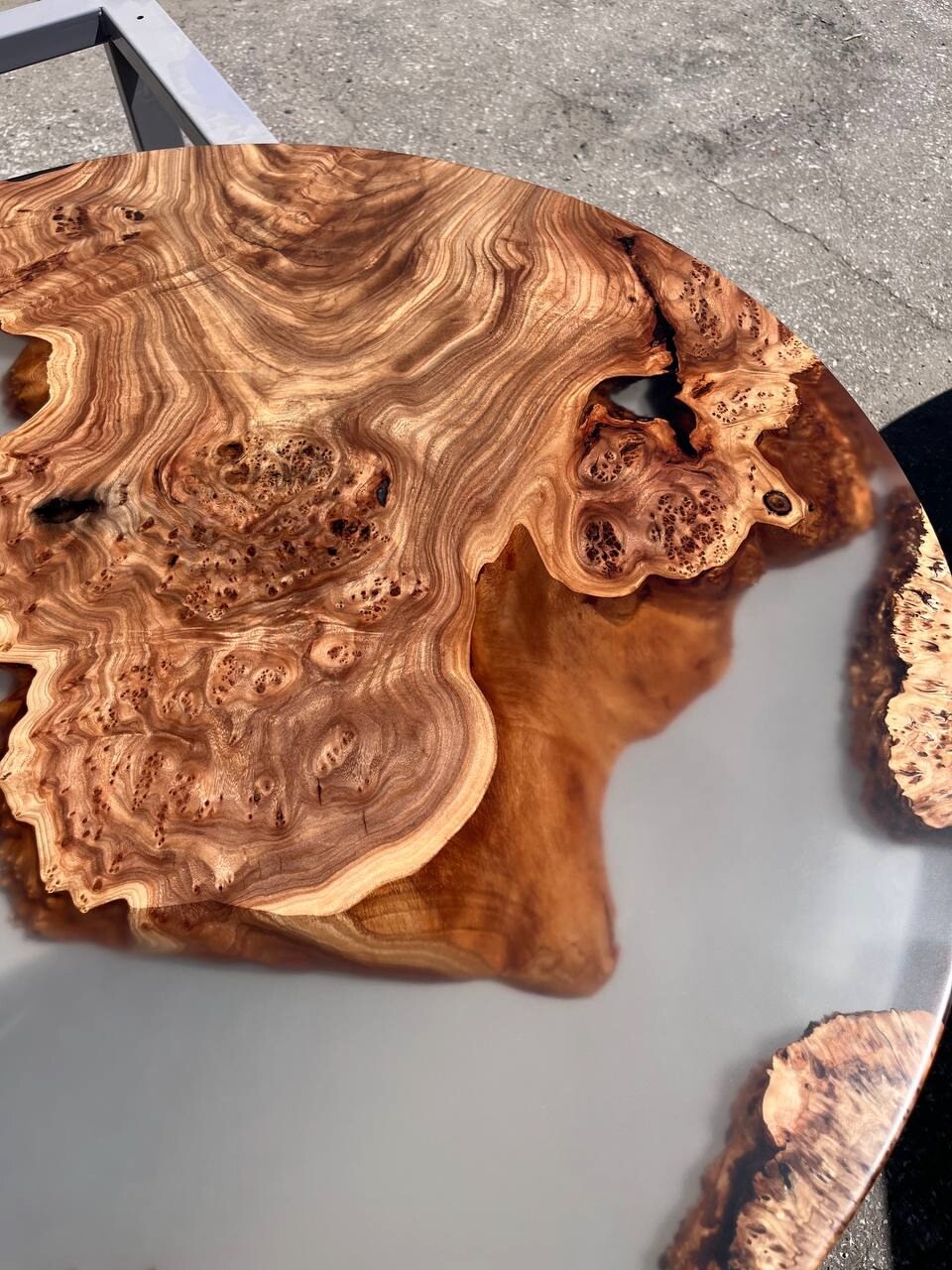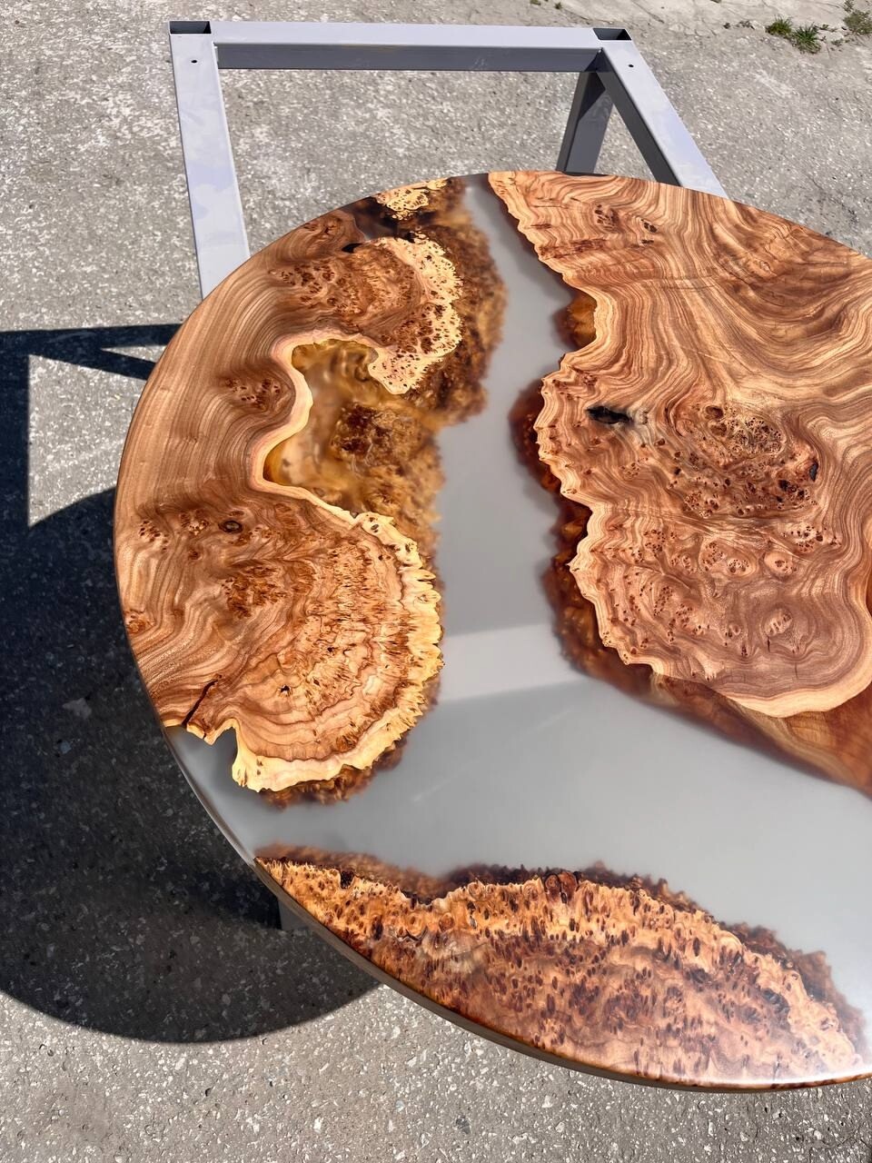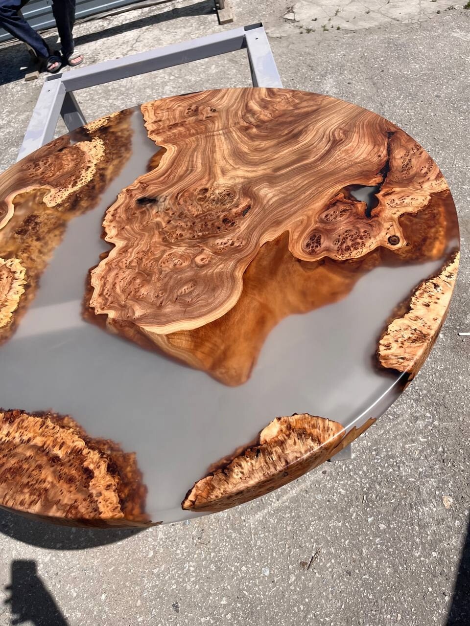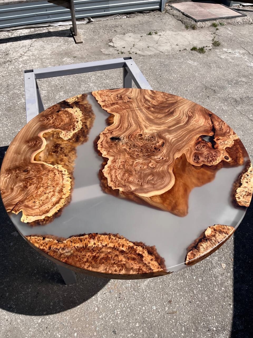 Представляем вашему вниманию уникальный круглый стол, где естественная красота карагача переплетается с прозрачными потоками эпоксидной смолы. Этот шедевр станет настоящим центром притяжения в вашем интерьере!