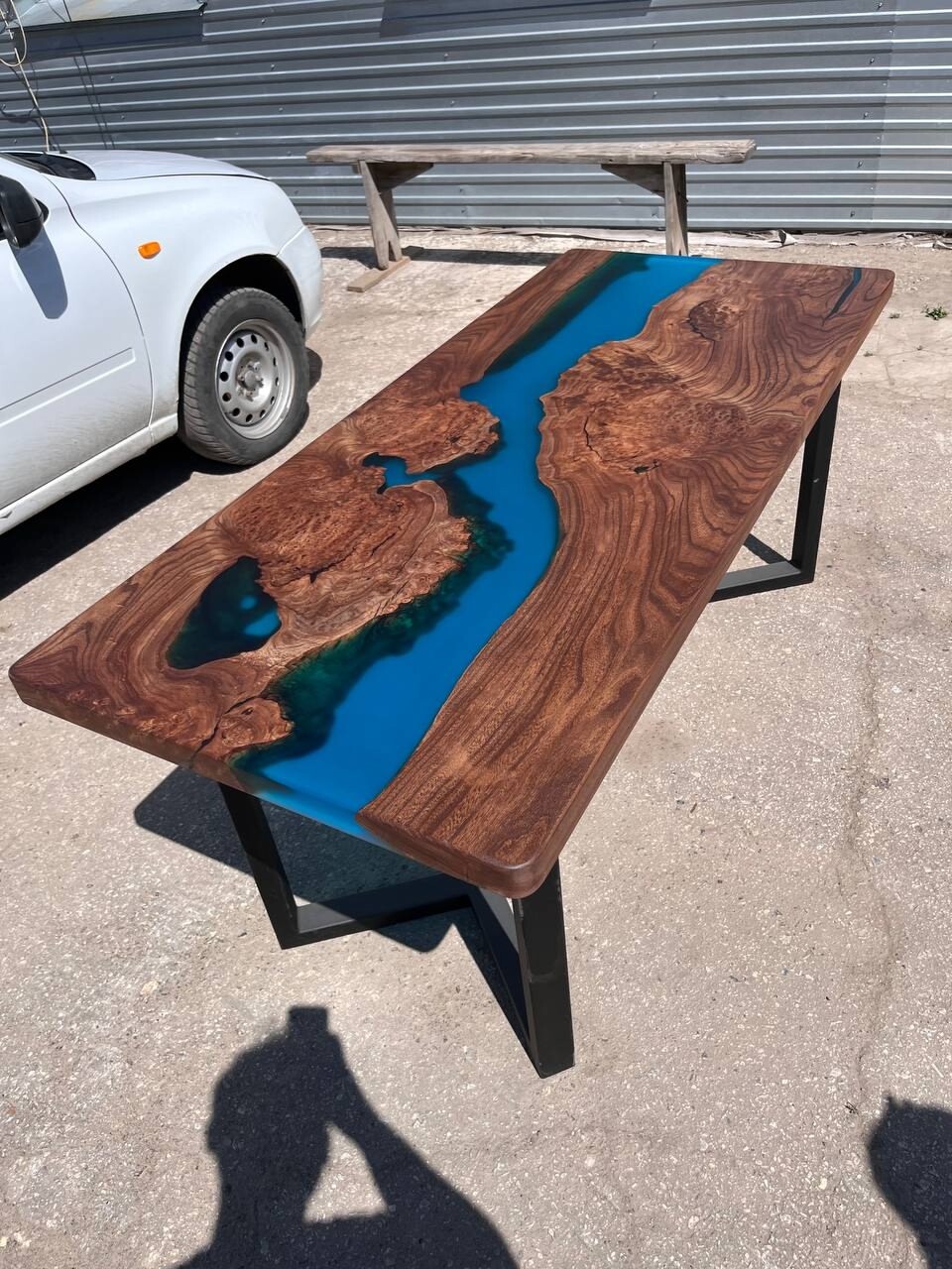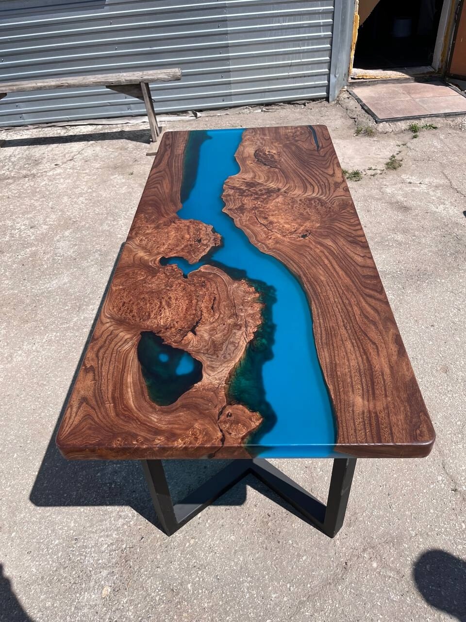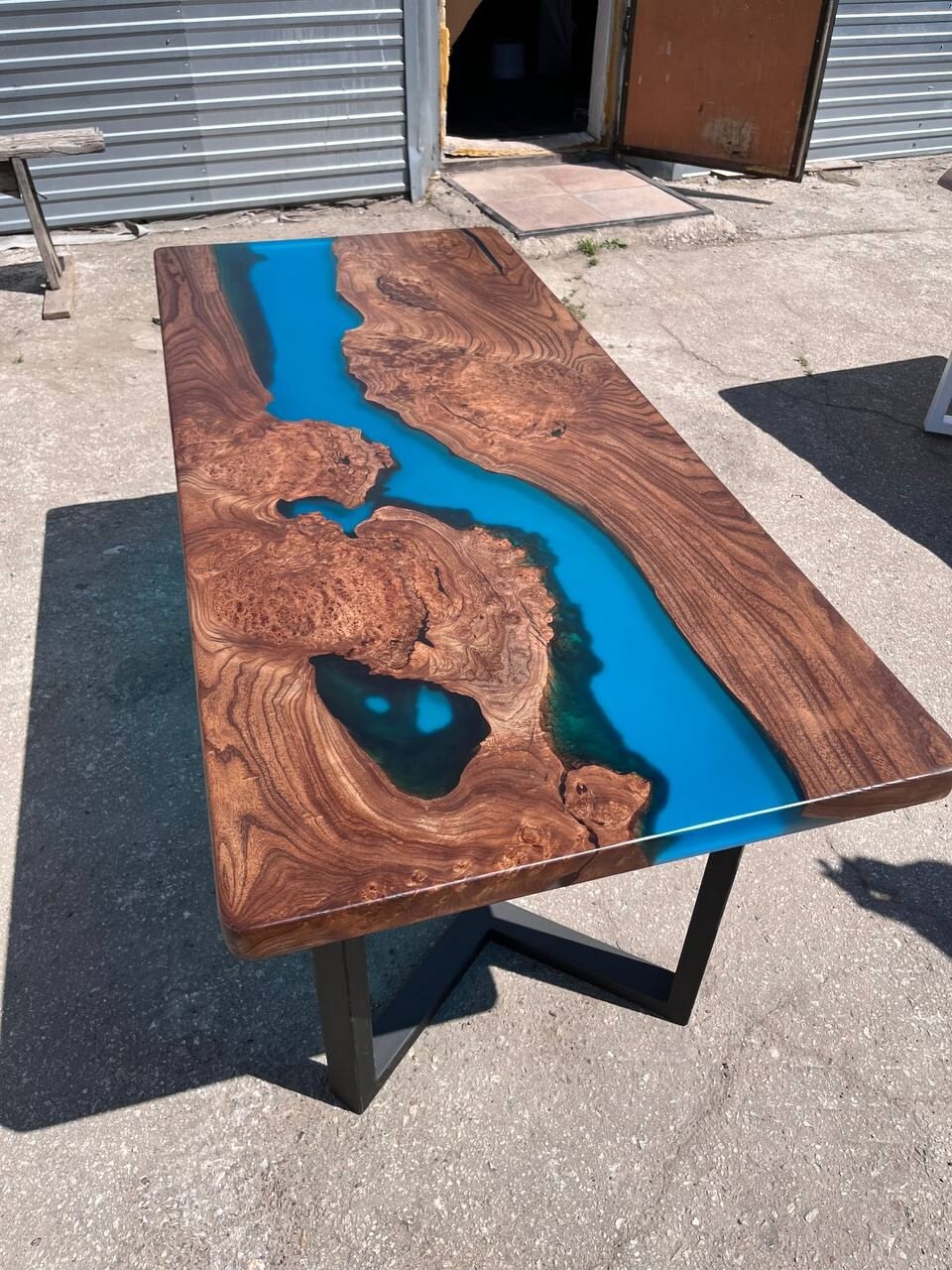 Представляем вашему вниманию величественный стол, где природная красота встречается с современным дизайном. В этом произведении искусства эпоксидная смола создает потрясающий контраст с благородной текстурой карагача.