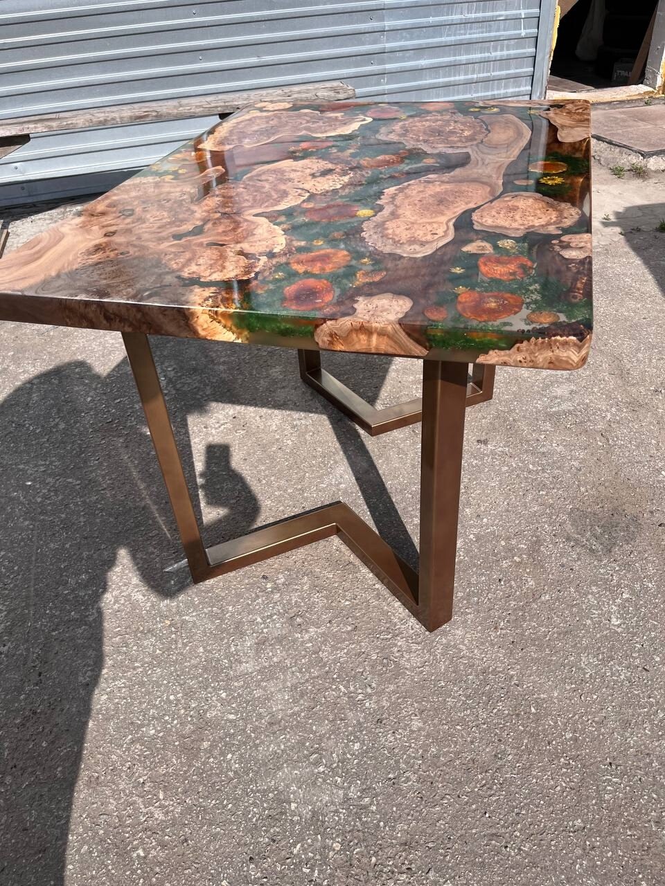 Мы начинаем заливать, дальше мы покрываем стол маслом или лаком. Затем, изготавливаем и красим ножки , после этого мы собираем вместе с ножками стол, фотографируем вам, если все хорошо ,вы отправляете вторую часть.