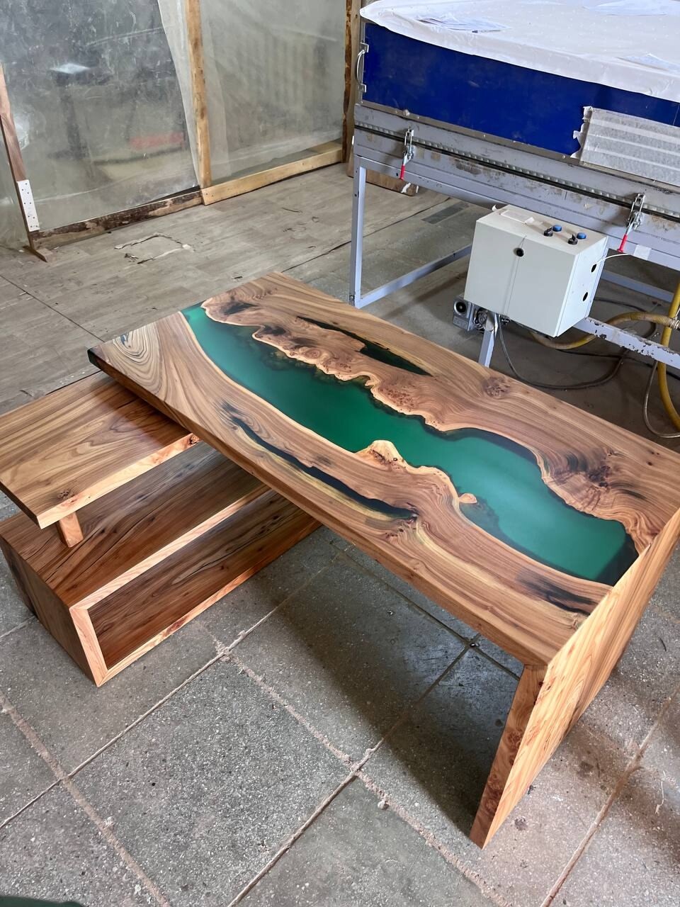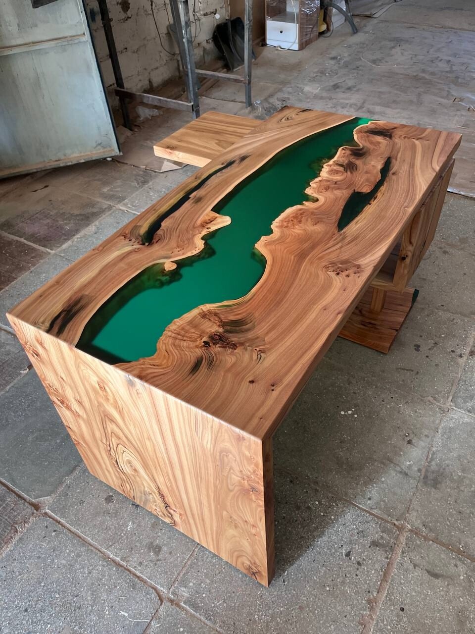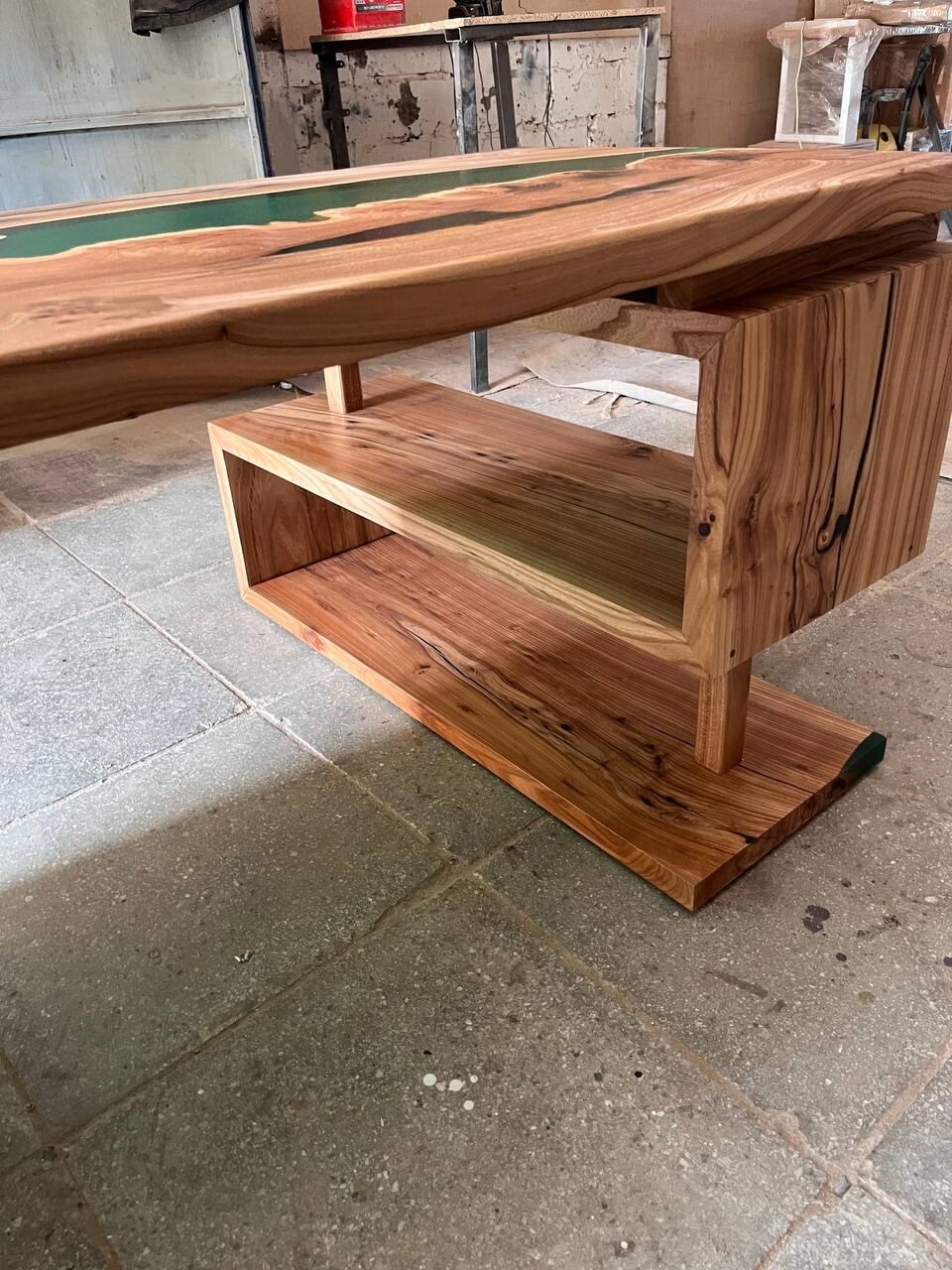 Каждая столешница - это уникальная композиция из природных узоров карагача и застывшей реки смолы. Этот стол станет не просто рабочим местом, а настоящим источником вдохновения!