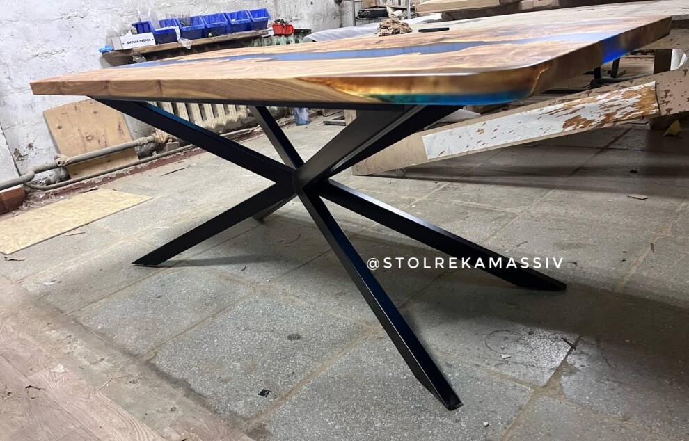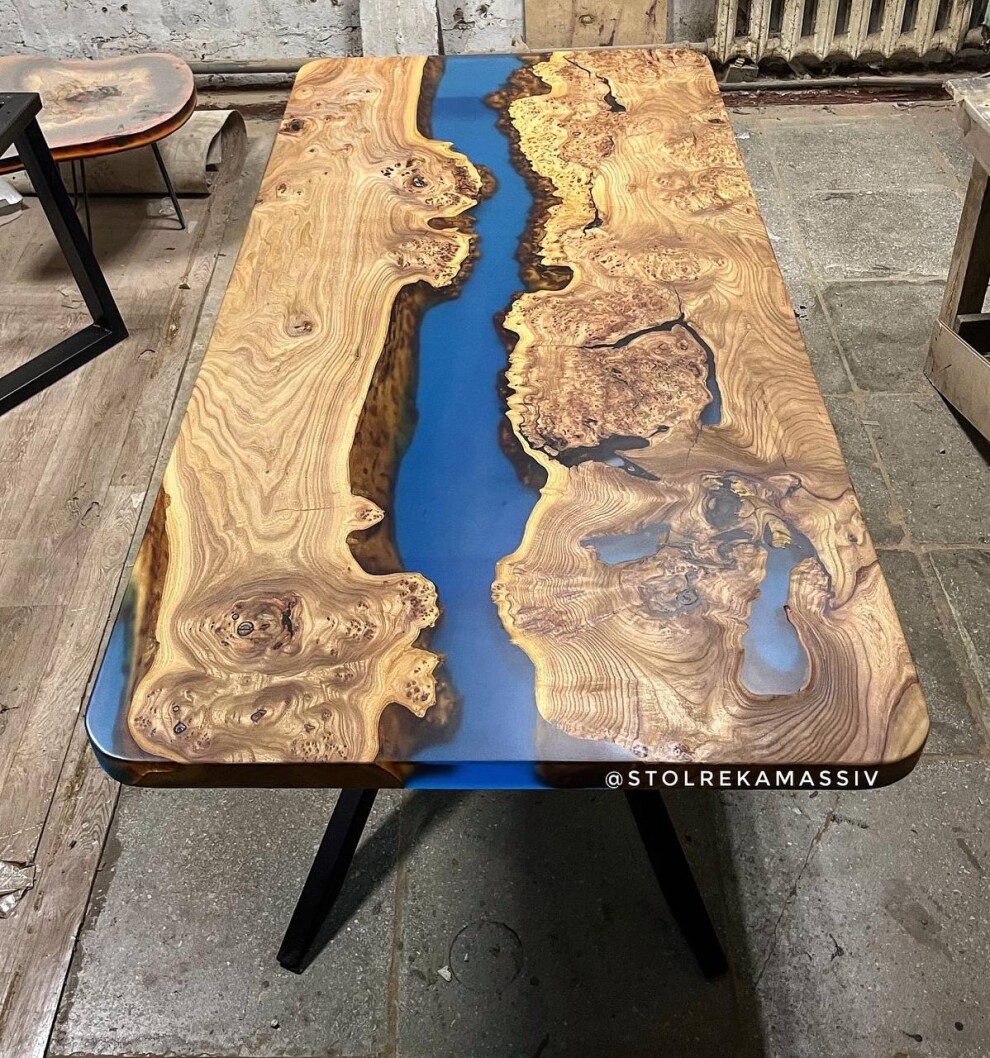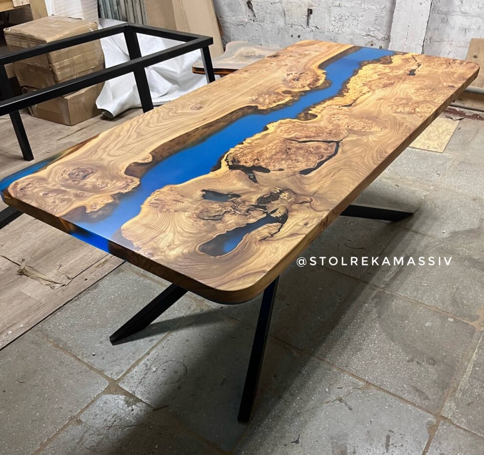 Грандиозный стол “Река” из капового карагача с сапфировой заливкой - центр притяжения вашего интерьера!